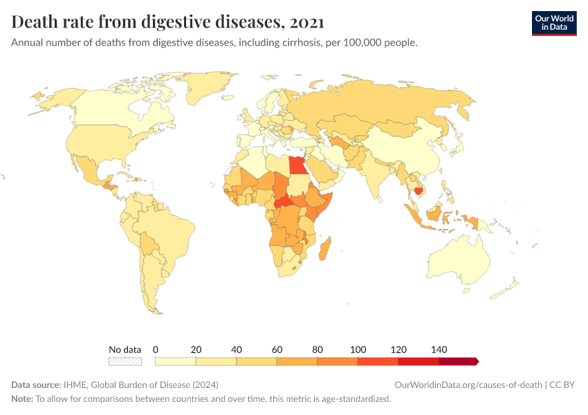 IHME, Global Burden of Disease (2024) – with minor processing by Our World in Data. “Death rate from digestive diseases” [dataset]. IHME, Global Burden of Disease, “Global Burden of Disease - Deaths and DALYs” [original data]. Retrieved November 2, 2025 from https://auto-epoch.owid.pages.dev:8789/20250909-093708/grapher/death-rate-from-digestive-diseases.html (archived on September 9, 2025).