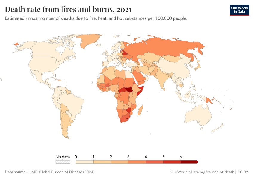 IHME, Global Burden of Disease (2024) – with minor processing by Our World in Data. “Death rate from fires and burns” [dataset]. IHME, Global Burden of Disease, “Global Burden of Disease - Deaths and DALYs” [original data]. Retrieved November 2, 2025 from https://auto-epoch.owid.pages.dev:8789/20250909-093708/grapher/death-rate-from-fires-and-burns-ihme.html (archived on September 9, 2025).