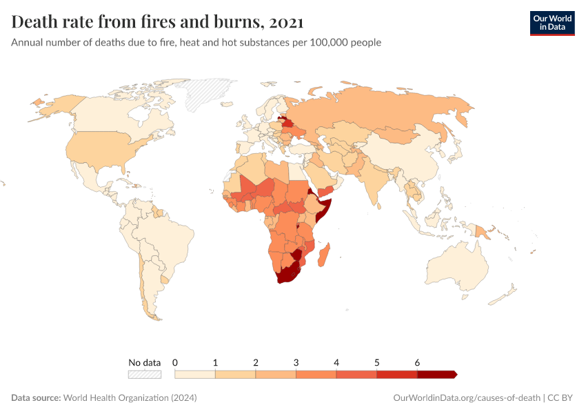 World Health Organization (2024) – with major processing by Our World in Data. “Death rate from fires and burns” [dataset]. World Health Organization, “Global Health Estimates” [original data]. Retrieved November 2, 2025 from https://auto-epoch.owid.pages.dev:8789/20250909-093708/grapher/death-rate-from-fires-and-burns-who.html (archived on September 9, 2025).