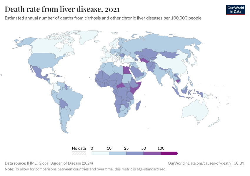 IHME, Global Burden of Disease (2024) – with minor processing by Our World in Data. “Death rate from liver disease” [dataset]. IHME, Global Burden of Disease, “Global Burden of Disease - Deaths and DALYs” [original data]. Retrieved November 2, 2025 from https://auto-epoch.owid.pages.dev:8789/20250909-093708/grapher/death-rate-from-liver-disease.html (archived on September 9, 2025).