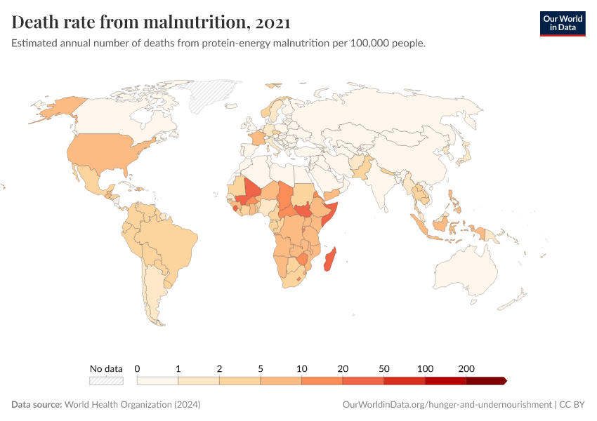 World Health Organization (2024) – with major processing by Our World in Data. “Death rate from malnutrition” [dataset]. World Health Organization, “Global Health Estimates” [original data]. Retrieved November 2, 2025 from https://auto-epoch.owid.pages.dev:8789/20250909-093708/grapher/death-rate-from-malnutrition-ghe.html (archived on September 9, 2025).