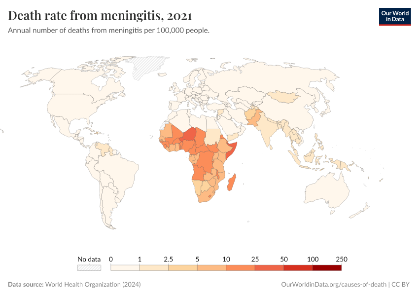 “Data Page: Death rate from meningitis”, part of the following publication: Esteban Ortiz-Ospina and Max Roser (2016) - “Global Health”. Data adapted from World Health Organization. Retrieved from https://auto-epoch.owid.pages.dev:8789/20250909-093708/grapher/death-rate-from-meningitis-who.html [online resource] (archived on September 9, 2025).How to cite this data