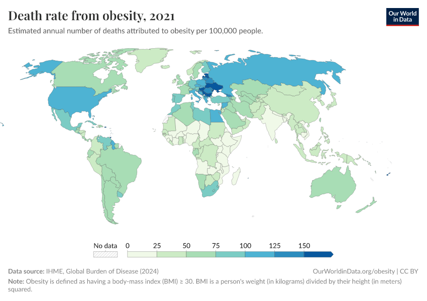 IHME, Global Burden of Disease (2024) – with minor processing by Our World in Data. “Death rate from obesity” [dataset]. IHME, Global Burden of Disease, “Global Burden of Disease - Risk Factors” [original data]. Retrieved November 2, 2025 from https://auto-epoch.owid.pages.dev:8789/20250909-093708/grapher/death-rate-from-obesity-gbd.html (archived on September 9, 2025).