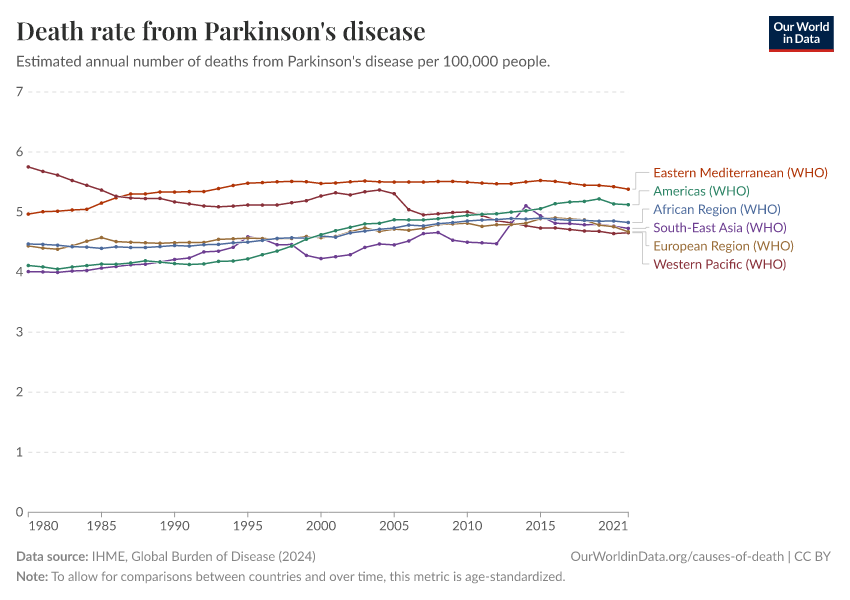 IHME, Global Burden of Disease (2024) – with minor processing by Our World in Data. “Death rate from Parkinson's disease” [dataset]. IHME, Global Burden of Disease, “Global Burden of Disease - Deaths and DALYs” [original data]. Retrieved November 2, 2025 from https://auto-epoch.owid.pages.dev:8789/20250909-093708/grapher/death-rate-from-parkinsons-disease.html (archived on September 9, 2025).