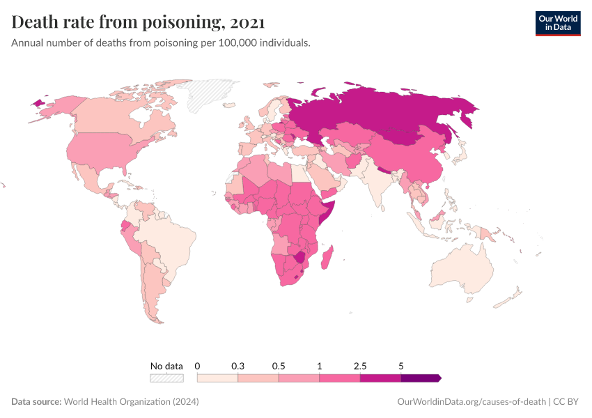 World Health Organization (2024) – with major processing by Our World in Data. “Death rate from poisoning” [dataset]. World Health Organization, “Global Health Estimates” [original data]. Retrieved November 2, 2025 from https://auto-epoch.owid.pages.dev:8789/20250909-093708/grapher/death-rate-from-poisoning-ghe.html (archived on September 9, 2025).