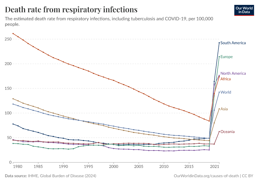 IHME, Global Burden of Disease (2024) – with minor processing by Our World in Data. “Death rate from respiratory infections” [dataset]. IHME, Global Burden of Disease, “Global Burden of Disease - Deaths and DALYs” [original data]. Retrieved November 2, 2025 from https://auto-epoch.owid.pages.dev:8789/20250909-093708/grapher/death-rate-from-respiratory-infections-gbd.html (archived on September 9, 2025).