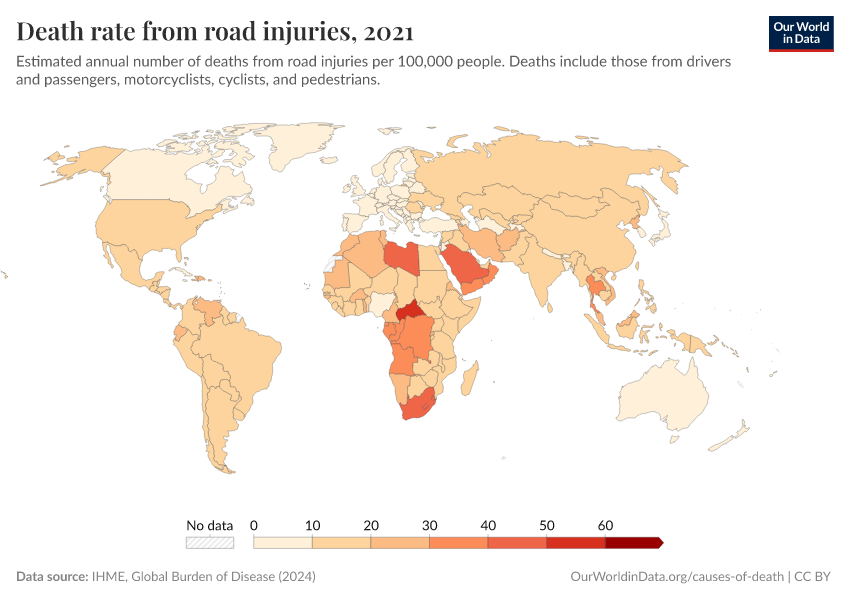 IHME, Global Burden of Disease (2024) – with minor processing by Our World in Data. “Death rate from road injuries” [dataset]. IHME, Global Burden of Disease, “Global Burden of Disease - Deaths and DALYs” [original data]. Retrieved November 2, 2025 from https://auto-epoch.owid.pages.dev:8789/20250909-093708/grapher/death-rate-from-road-accidents.html (archived on September 9, 2025).