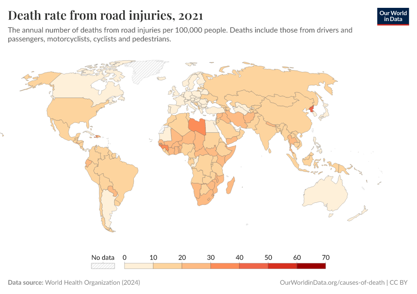 World Health Organization (2024) – with major processing by Our World in Data. “Death rate from road injuries” [dataset]. World Health Organization, “Global Health Estimates” [original data]. Retrieved November 2, 2025 from https://auto-epoch.owid.pages.dev:8789/20250909-093708/grapher/death-rate-from-road-accidents-ghe.html (archived on September 9, 2025).