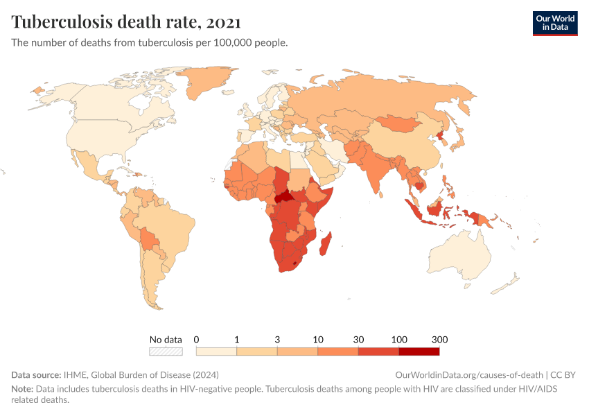 IHME, Global Burden of Disease (2024) – with minor processing by Our World in Data. “Tuberculosis death rate” [dataset]. IHME, Global Burden of Disease, “Global Burden of Disease - Deaths and DALYs” [original data]. Retrieved November 2, 2025 from https://auto-epoch.owid.pages.dev:8789/20250909-093708/grapher/death-rate-from-tuberculosis-gbd.html (archived on September 9, 2025).