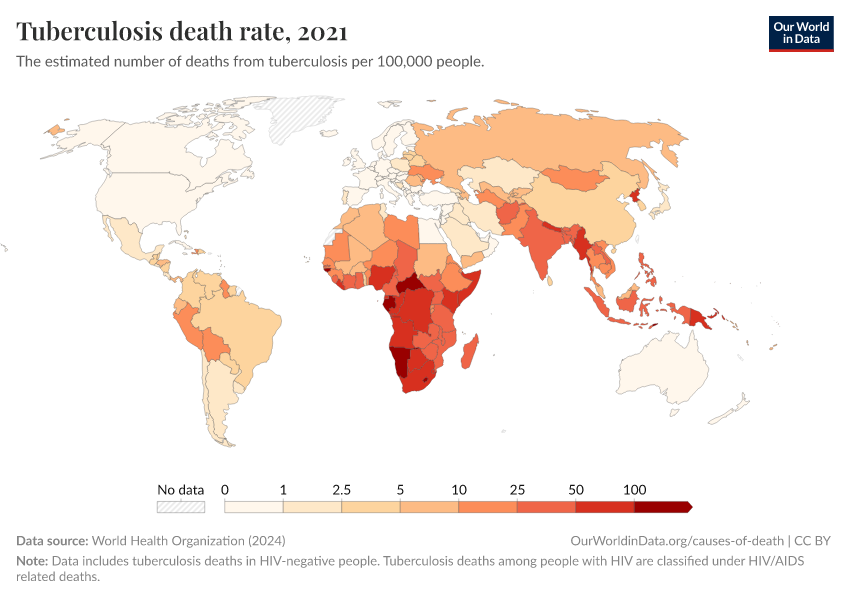 World Health Organization (2024) – with major processing by Our World in Data. “Tuberculosis death rate” [dataset]. World Health Organization, “Global Health Estimates” [original data]. Retrieved November 2, 2025 from https://auto-epoch.owid.pages.dev:8789/20250909-093708/grapher/death-rate-from-tuberculosis-ghe.html (archived on September 9, 2025).
