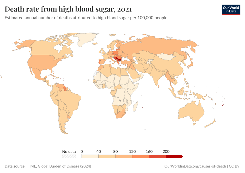IHME, Global Burden of Disease (2024) – with minor processing by Our World in Data. “Death rate from high blood sugar” [dataset]. IHME, Global Burden of Disease, “Global Burden of Disease - Risk Factors” [original data]. Retrieved November 2, 2025 from https://auto-epoch.owid.pages.dev:8789/20250909-093708/grapher/death-rates-from-high-blood-sugar-gbd.html (archived on September 9, 2025).
