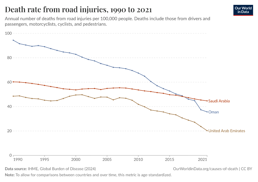 “Data Page: Death rate from road injuries”, part of the following publication: Esteban Ortiz-Ospina and Max Roser (2016) - “Global Health”. Data adapted from IHME, Global Burden of Disease. Retrieved from https://auto-epoch.owid.pages.dev:8789/20251029-110753/grapher/death-rates-road-incidents.html [online resource] (archived on October 29, 2025).