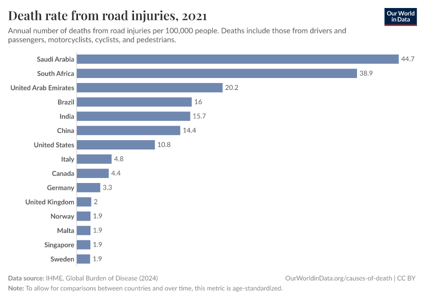 “Data Page: Death rate from road injuries”, part of the following publication: Esteban Ortiz-Ospina and Max Roser (2016) - “Global Health”. Data adapted from IHME, Global Burden of Disease. Retrieved from https://auto-epoch.owid.pages.dev:8789/20250909-093708/grapher/death-rates-road-incidents.html [online resource] (archived on September 9, 2025).