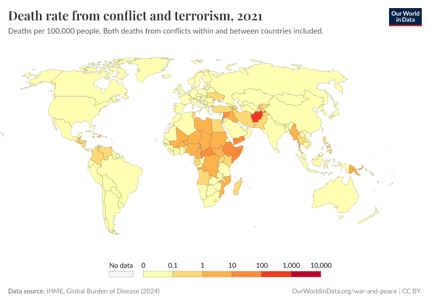 IHME, Global Burden of Disease (2024) – with minor processing by Our World in Data. “Death rate from conflict and terrorism” [dataset]. IHME, Global Burden of Disease, “Global Burden of Disease - Deaths and DALYs” [original data]. Retrieved November 2, 2025 from https://auto-epoch.owid.pages.dev:8789/20250909-093708/grapher/deaths-conflict-terrorism-per-100000.html (archived on September 9, 2025).