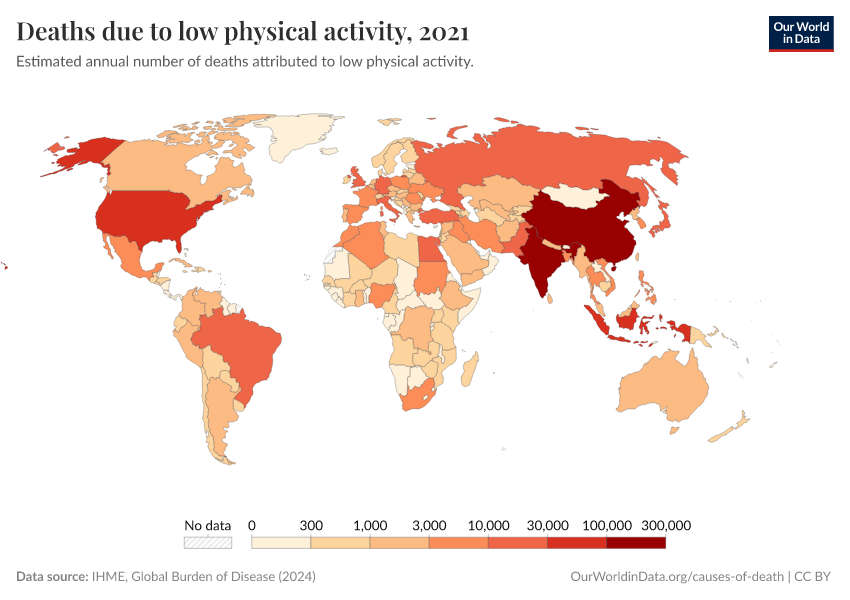 “Data Page: Deaths due to low physical activity”, part of the following publication: Esteban Ortiz-Ospina and Max Roser (2016) - “Global Health”. Data adapted from IHME, Global Burden of Disease. Retrieved from https://auto-epoch.owid.pages.dev:8789/20250909-093708/grapher/deaths-due-to-low-physical-activity.html [online resource] (archived on September 9, 2025).How to cite this data