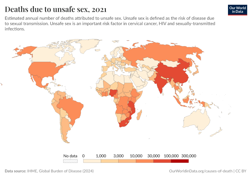 IHME, Global Burden of Disease (2024) – with minor processing by Our World in Data. “Deaths due to unsafe sex” [dataset]. IHME, Global Burden of Disease, “Global Burden of Disease - Risk Factors” [original data]. Retrieved November 2, 2025 from https://auto-epoch.owid.pages.dev:8789/20250909-093708/grapher/deaths-due-to-unsafe-sex.html (archived on September 9, 2025).