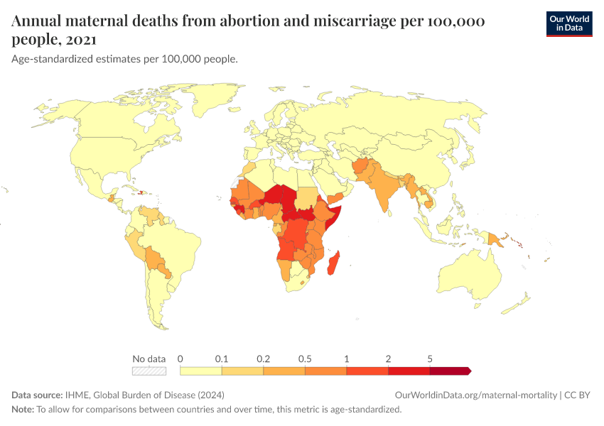 IHME, Global Burden of Disease (2024) – with minor processing by Our World in Data. “Annual maternal deaths from abortion and miscarriage per 100,000 people” [dataset]. IHME, Global Burden of Disease, “Global Burden of Disease - Deaths and DALYs” [original data]. Retrieved February 1, 2026 from https://auto-epoch.owid.pages.dev:8789/20260108-164518/grapher/deaths-from-abortion-and-miscarriage-per-100000-people.html (archived on January 8, 2026).