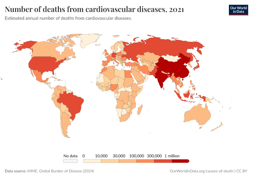 “Data Page: Number of deaths from cardiovascular diseases”, part of the following publication: Esteban Ortiz-Ospina and Max Roser (2016) - “Global Health”. Data adapted from IHME, Global Burden of Disease. Retrieved from https://auto-epoch.owid.pages.dev:8789/20250909-093708/grapher/deaths-from-cardiovascular-disease.html [online resource] (archived on September 9, 2025).How to cite this data