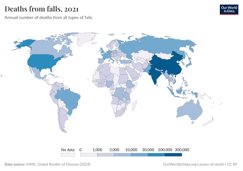IHME, Global Burden of Disease (2024) – with minor processing by Our World in Data. “Deaths from falls” [dataset]. IHME, Global Burden of Disease, “Global Burden of Disease - Deaths and DALYs” [original data]. Retrieved November 2, 2025 from https://auto-epoch.owid.pages.dev:8789/20250909-093708/grapher/deaths-from-falls-gbd.html (archived on September 9, 2025).