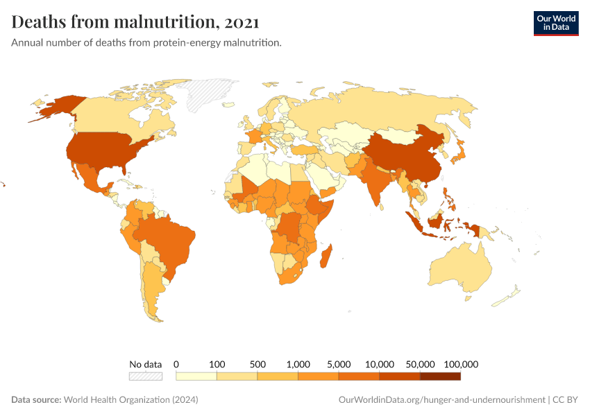 World Health Organization (2024) – with major processing by Our World in Data. “Deaths from malnutrition” [dataset]. World Health Organization, “Global Health Estimates” [original data]. Retrieved November 2, 2025 from https://auto-epoch.owid.pages.dev:8789/20250909-093708/grapher/deaths-from-malnutrition-ghe.html (archived on September 9, 2025).