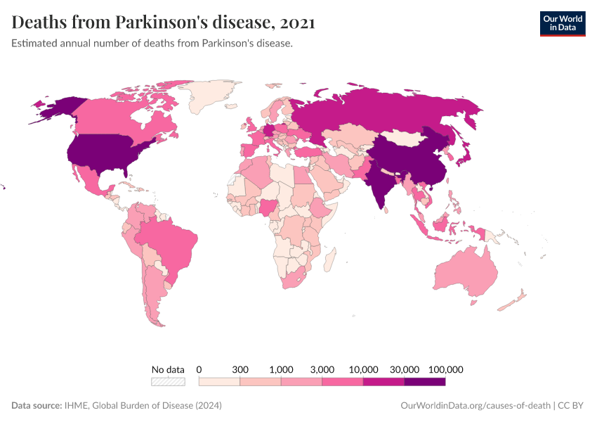 “Data Page: Deaths from Parkinson's disease”, part of the following publication: Esteban Ortiz-Ospina and Max Roser (2016) - “Global Health”. Data adapted from IHME, Global Burden of Disease. Retrieved from https://auto-epoch.owid.pages.dev:8789/20250909-093708/grapher/deaths-from-parkinsons-disease.html [online resource] (archived on September 9, 2025).How to cite this data