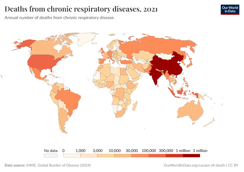IHME, Global Burden of Disease (2024) – with minor processing by Our World in Data. “Deaths from chronic respiratory diseases” [dataset]. IHME, Global Burden of Disease, “Global Burden of Disease - Deaths and DALYs” [original data]. Retrieved November 2, 2025 from https://auto-epoch.owid.pages.dev:8789/20250909-093708/grapher/deaths-from-respiratory-disease.html (archived on September 9, 2025).