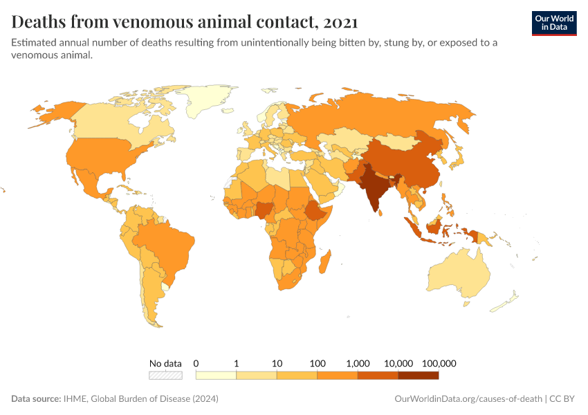 IHME, Global Burden of Disease (2024) – with minor processing by Our World in Data. “Deaths from venomous animal contact” [dataset]. IHME, Global Burden of Disease, “Global Burden of Disease - Deaths and DALYs” [original data]. Retrieved November 2, 2025 from https://auto-epoch.owid.pages.dev:8789/20250909-093708/grapher/deaths-from-venomous-animal-contact.html (archived on September 9, 2025).
