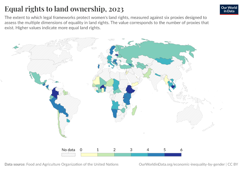 Food and Agriculture Organization of the United Nations – processed by Our World in Data. “Equal rights to land ownership” [dataset]. Food and Agriculture Organization of the United Nations, “Data from multiple sources” [original data]. Retrieved November 2, 2025 from https://auto-epoch.owid.pages.dev:8789/20250909-093708/grapher/degree-to-which-the-legal-framework-guarantees-womens-equal-rights-to-land-ownership-andor-control.html (archived on September 9, 2025).