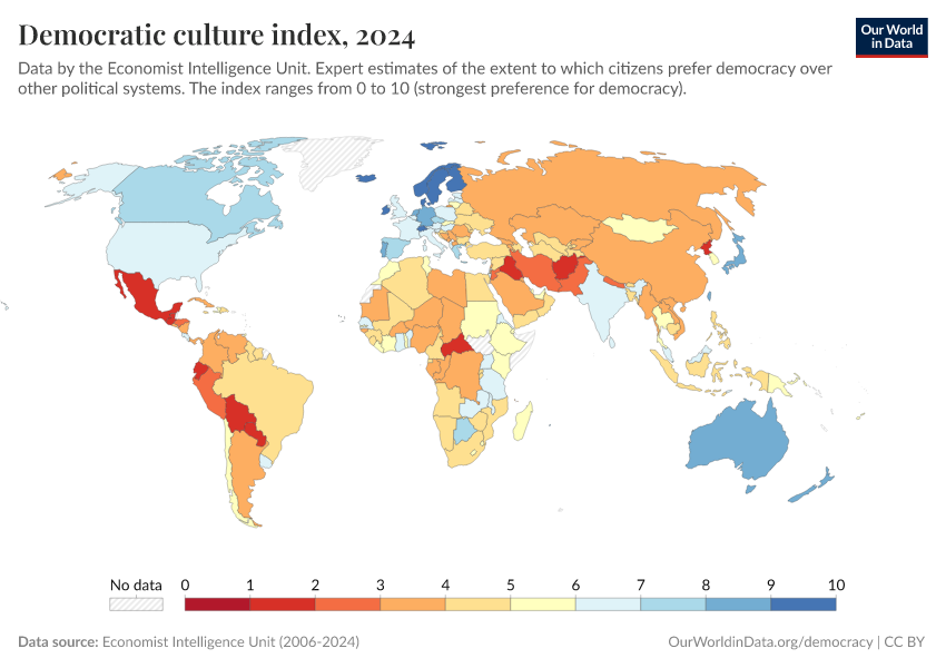 Economist Intelligence Unit (2006-2024) – processed by Our World in Data. “Democratic culture index” [dataset]. Economist Intelligence Unit, “Democracy Index 2021: The China challenge”; Economist Intelligence Unit, “Democracy Index 2022: Frontline democracy and the battle for Ukraine”; Economist Intelligence Unit, “Democracy Index 2023: Age of Conflict”; Economist Intelligence Unit, “Democracy Index 2024: What's wrong with representative democracy?”; Gapminder, “Democracy Index v4”; Various sources, “Population” [original data]. Retrieved November 2, 2025 from https://auto-epoch.owid.pages.dev:8789/20250925-233948/grapher/democratic-culture-index-eiu.html (archived on September 25, 2025).