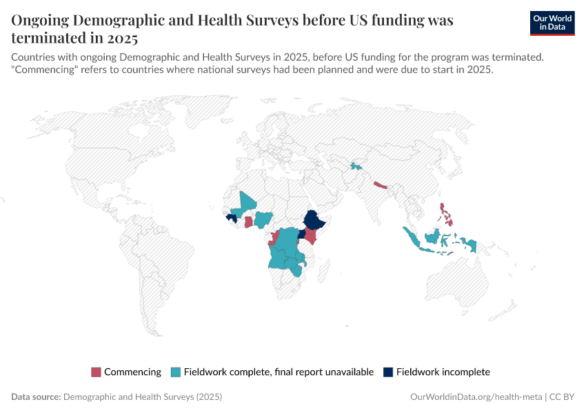 Demographic and Health Surveys (2025) – processed by Our World in Data. “Ongoing Demographic and Health Surveys before US funding was terminated in 2025” [dataset]. Demographic and Health Surveys (2025), “Ongoing DHS surveys before termination” [original data]. Retrieved November 2, 2025 from https://auto-epoch.owid.pages.dev:8789/20250909-093708/grapher/demographic-and-health-surveys-that-were-ongoing-before-termination.html (archived on September 9, 2025).