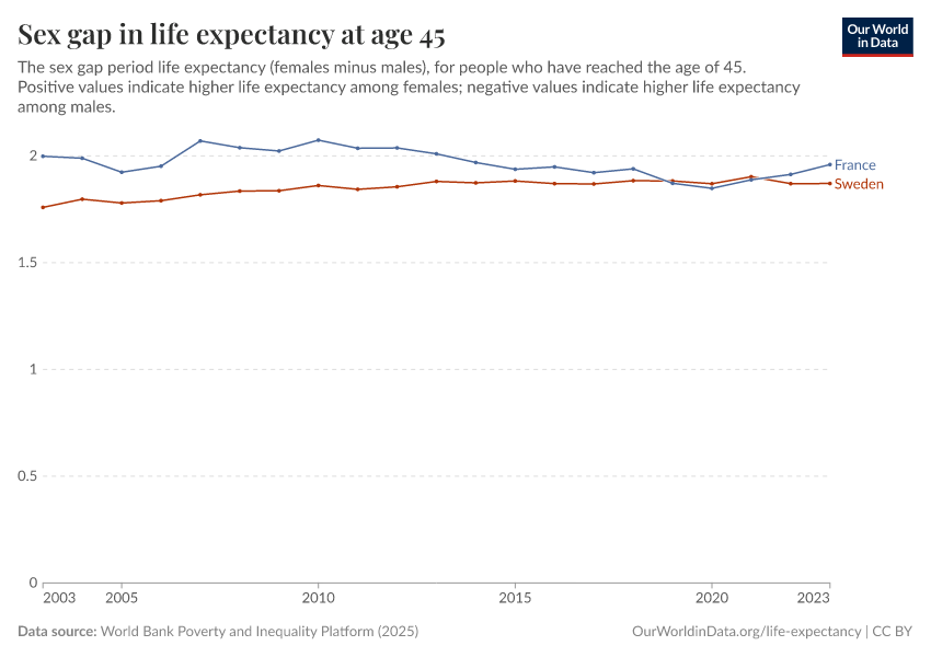 Human Mortality Database (2024); UN, World Population Prospects (2024) – with major processing by Our World in Data. “Life expectancy at 45 – HMD – female-male difference, period tables” [dataset]. Human Mortality Database, “Human Mortality Database”; United Nations, “World Population Prospects” [original data]. Retrieved November 2, 2025 from https://auto-epoch.owid.pages.dev:8789/20250909-093708/grapher/difference-in-female-and-male-life-expectancy-at-age-45.html (archived on September 9, 2025).