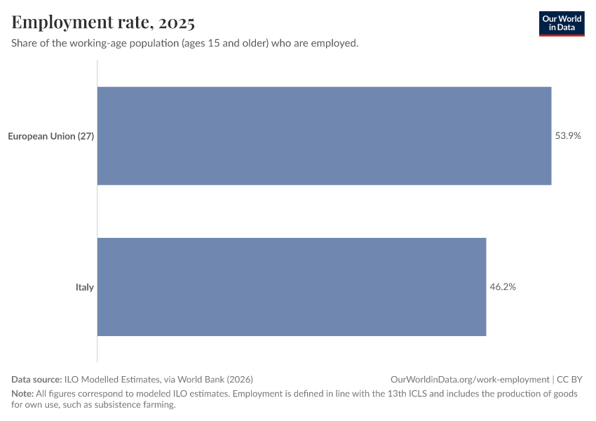 ILO Modelled Estimates, via World Bank (2026) – processed by Our World in Data. “Employment rate – ILO” [dataset]. ILO Modelled Estimates, via World Bank, “World Development Indicators 125” [original data]. Retrieved March 6, 2026 from https://auto-epoch.owid.pages.dev:8789/20260304-094028/grapher/employment-to-population-ratio.html (archived on March 4, 2026).
