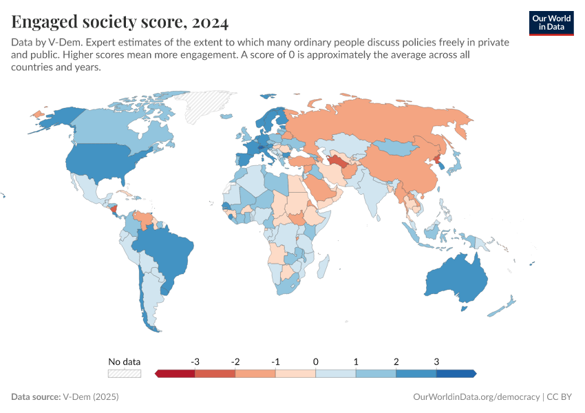 “Data Page: Engaged society”, part of the following publication: Bastian Herre, Lucas Rodés-Guirao, and Esteban Ortiz-Ospina (2013) - “Democracy”. Data adapted from V-Dem. Retrieved from https://auto-epoch.owid.pages.dev:8789/20250925-233948/grapher/engaged-society-score.html [online resource] (archived on September 25, 2025).How to cite this data