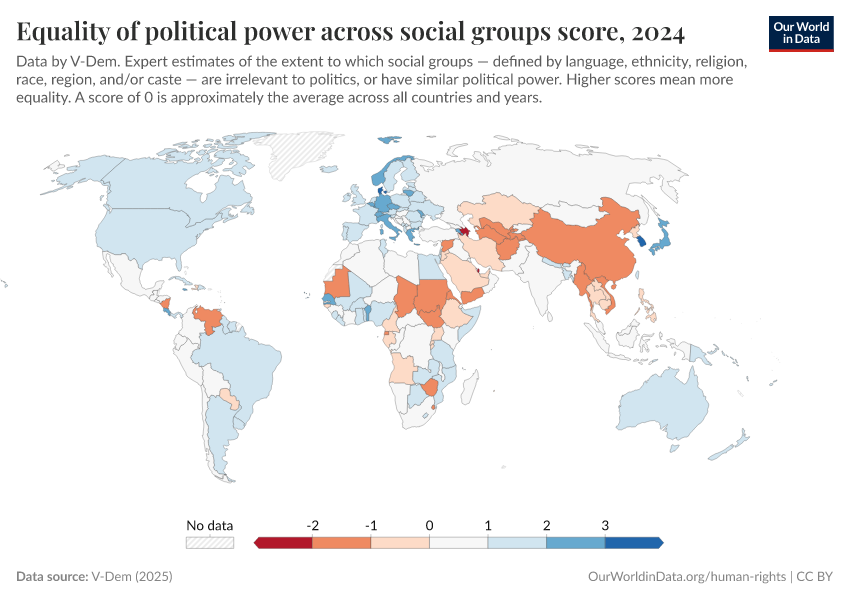 “Data Page: Equality of political power across social groups”, part of the following publication: Bastian Herre, Lucas Rodés-Guirao, and Esteban Ortiz-Ospina (2013) - “Democracy”. Data adapted from V-Dem. Retrieved from https://auto-epoch.owid.pages.dev:8789/20250925-233948/grapher/equality-of-political-power-across-social-groups-score.html [online resource] (archived on September 25, 2025).How to cite this data
