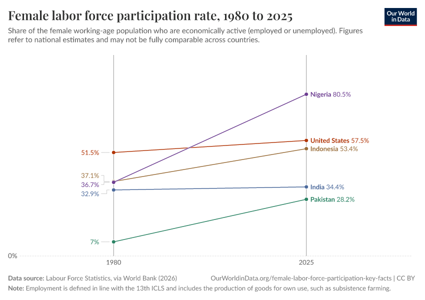 Labour Force Statistics, via World Bank (2026) – processed by Our World in Data. “Female labor force participation rate – ILO” [dataset]. Labour Force Statistics, via World Bank, “World Development Indicators 125” [original data]. Retrieved March 6, 2026 from https://auto-epoch.owid.pages.dev:8789/20260304-094028/grapher/female-labor-force-participation-rates-slopes.html (archived on March 4, 2026).