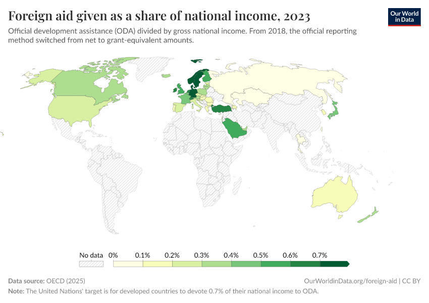 OECD (2025) – with minor processing by Our World in Data. “Foreign aid given as a share of national income – Official estimate” [dataset]. OECD, “OECD Official Development Assistance (ODA) - DAC1: Flows by provider (ODA+OOF+Private)” [original data]. Retrieved November 2, 2025 from https://auto-epoch.owid.pages.dev:8789/20250909-093708/grapher/foreign-aid-given-as-a-share-of-national-income.html (archived on September 9, 2025).