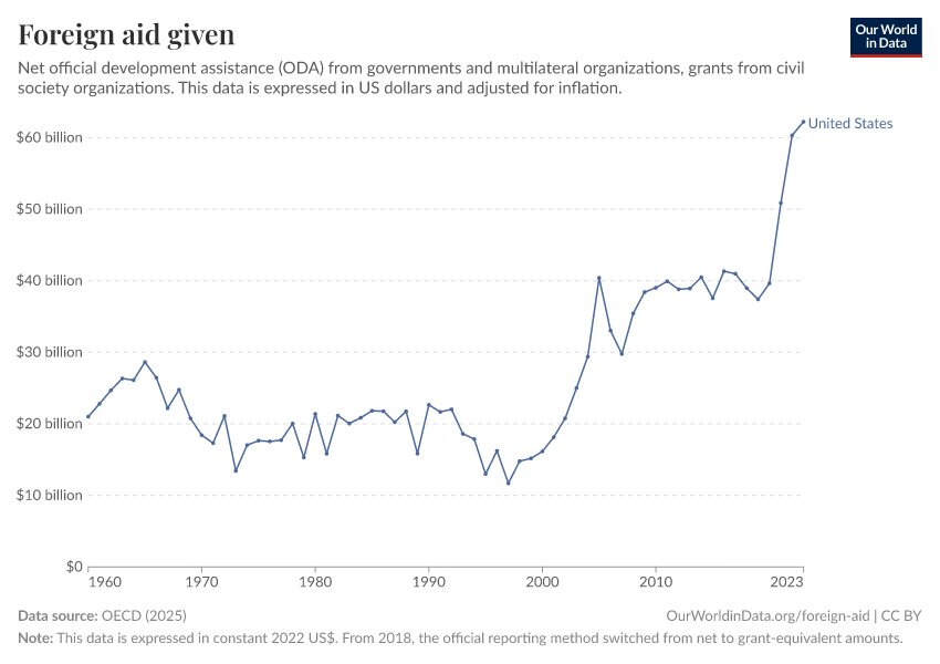OECD (2025) – with major processing by Our World in Data. “Foreign aid given – Net disbursements” [dataset]. OECD, “OECD Official Development Assistance (ODA) - DAC1: Flows by provider (ODA+OOF+Private)”; OECD, “OECD Official Development Assistance (ODA) - DAC2A: Aid (ODA) disbursements to countries and regions” [original data]. Retrieved November 2, 2025 from https://auto-epoch.owid.pages.dev:8789/20250909-093708/grapher/foreign-aid-given-net.html (archived on September 9, 2025).