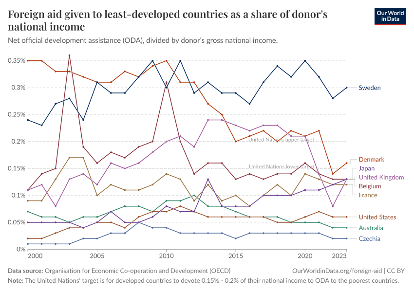 “Data Page: Foreign aid given to least-developed countries as a share of donor's national income”. Our World in Data (2026). Data adapted from Organisation for Economic Co-operation and Development. Retrieved from https://auto-epoch.owid.pages.dev:8789/20251120-211038/grapher/foreign-aid-given-to-least-developed-countries-as-a-share-of-donors-national-income.html [online resource] (archived on November 20, 2025).How to cite this data
