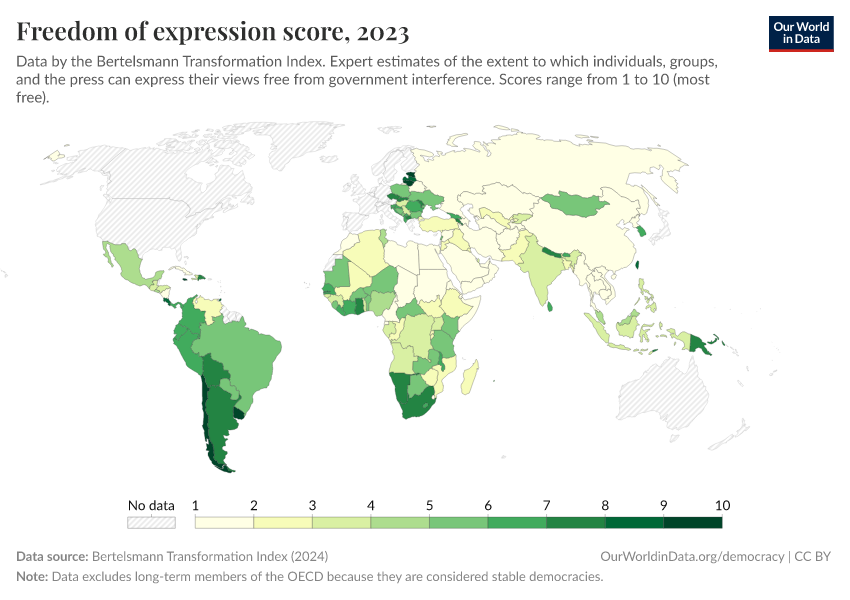 “Data Page: Freedom of expression score”, part of the following publication: Bastian Herre, Lucas Rodés-Guirao, and Esteban Ortiz-Ospina (2013) - “Democracy”. Data adapted from Bertelsmann Transformation Index. Retrieved from https://auto-epoch.owid.pages.dev:8789/20250909-093708/grapher/freedom-of-expression-score-bti.html [online resource] (archived on September 9, 2025).How to cite this data