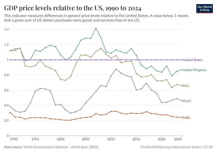 World Development Indicators - World Bank (2025) – processed by Our World in Data. “GDP price levels relative to the US – World Bank” [dataset]. World Development Indicators - World Bank, “World Development Indicators 122” [original data]. Retrieved November 2, 2025 from https://auto-epoch.owid.pages.dev:8789/20250916-100934/grapher/gdp-price-levels-relative-to-the-us.html (archived on September 16, 2025).