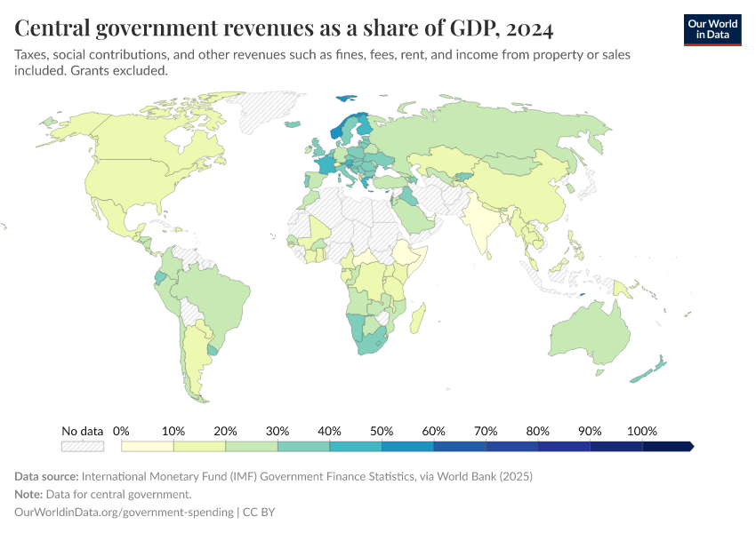 “Data Page: Central government revenues as a share of GDP”. Our World in Data (2025). Data adapted from International Monetary Fund (IMF) Government Finance Statistics, via World Bank. Retrieved from https://auto-epoch.owid.pages.dev:8789/20250916-102301/grapher/government-revenues-as-a-share-of-gdp-world-bank.html [online resource] (archived on September 16, 2025).How to cite this data