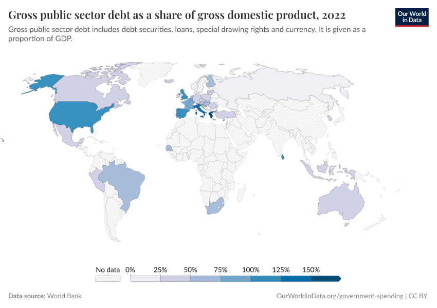 “Data Page: Gross public sector debt as a share of gross domestic product”. Our World in Data (2025). Data adapted from World Bank. Retrieved from https://auto-epoch.owid.pages.dev:8789/20250909-093708/grapher/gross-public-sector-debt-as-a-proportion-of-gdp.html [online resource] (archived on September 9, 2025).How to cite this data