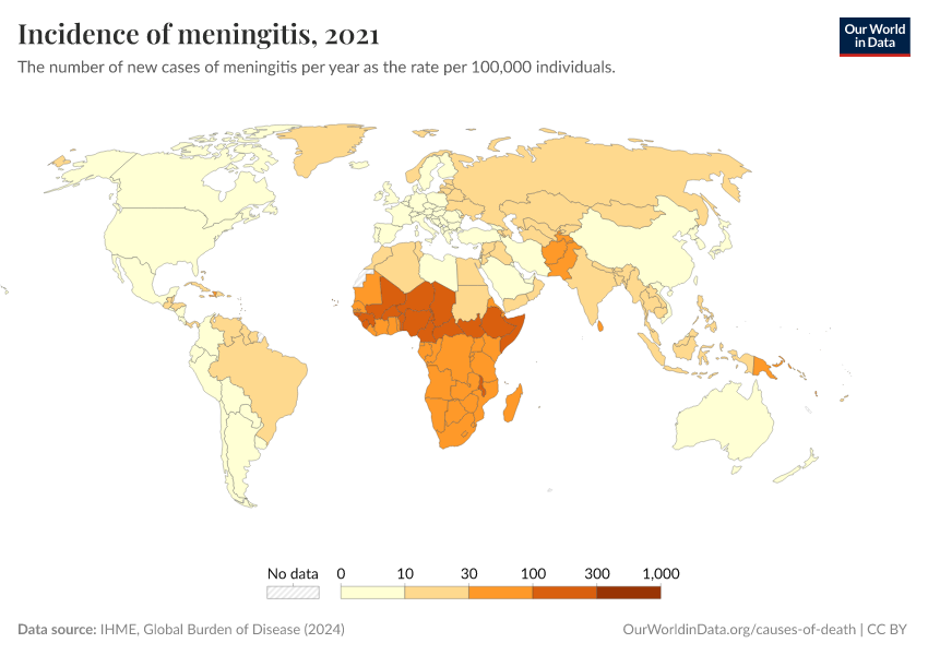 IHME, Global Burden of Disease (2024) – with major processing by Our World in Data. “Incidence of meningitis” [dataset]. IHME, Global Burden of Disease, “Global Burden of Disease - Prevalence and Incidence” [original data]. Retrieved November 2, 2025 from https://auto-epoch.owid.pages.dev:8789/20250909-093708/grapher/incidence-of-meningitis.html (archived on September 9, 2025).