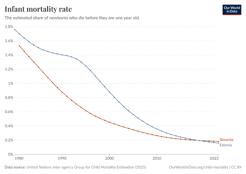 United Nations Inter-agency Group for Child Mortality Estimation (2025) – with major processing by Our World in Data. “Infant mortality rate” [dataset]. United Nations Inter-agency Group for Child Mortality Estimation, “United Nations Inter-agency Group for Child Mortality Estimation”; Various sources, “Population” [original data]. Retrieved November 2, 2025 from https://auto-epoch.owid.pages.dev:8789/20250925-233948/grapher/infant-mortality.html (archived on September 25, 2025).