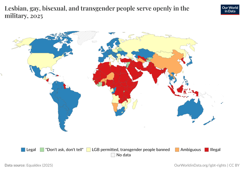 “Data Page: Lesbian, gay, bisexual, and transgender people serve openly in the military”, part of the following publication: Bastian Herre and Pablo Arriagada (2023) - “LGBT+ Rights”. Data adapted from Equaldex. Retrieved from https://auto-epoch.owid.pages.dev:8789/20250909-093708/grapher/lgbt-military-equaldex.html [online resource] (archived on September 9, 2025).How to cite this data
