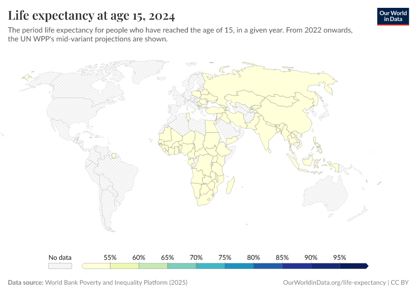 “Data Page: Life expectancy at 15”, part of the following publication: Saloni Dattani, Lucas Rodés-Guirao, Hannah Ritchie, Esteban Ortiz-Ospina, and Max Roser (2023) - “Life Expectancy”. Data adapted from Human Mortality Database, United Nations. Retrieved from https://auto-epoch.owid.pages.dev:8789/20250925-232706/grapher/life-expectancy-at-age-15.html [online resource] (archived on September 25, 2025).How to cite this data
