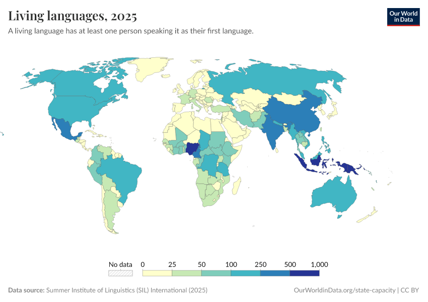 “Data Page: Living languages”, part of the following publication: Bastian Herre and Pablo Arriagada (2023) - “State Capacity”. Data adapted from Summer Institute of Linguistics (SIL) International. Retrieved from https://auto-epoch.owid.pages.dev:8789/20250909-093708/grapher/living-languages.html [online resource] (archived on September 9, 2025).How to cite this data