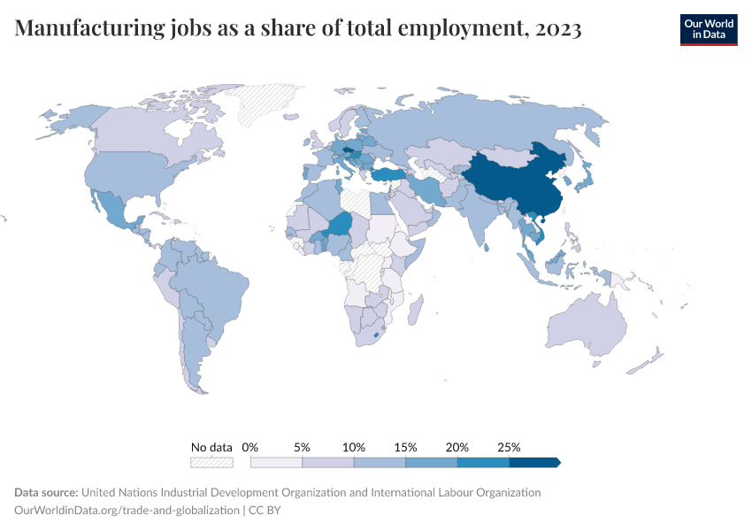 “Data Page: Manufacturing jobs as a share of total employment”. Our World in Data (2025). Data adapted from United Nations Industrial Development Organization and International Labour Organization. Retrieved from https://auto-epoch.owid.pages.dev:8789/20250923-151844/grapher/manufacturing-share-of-total-employment.html [online resource] (archived on September 23, 2025).How to cite this data
