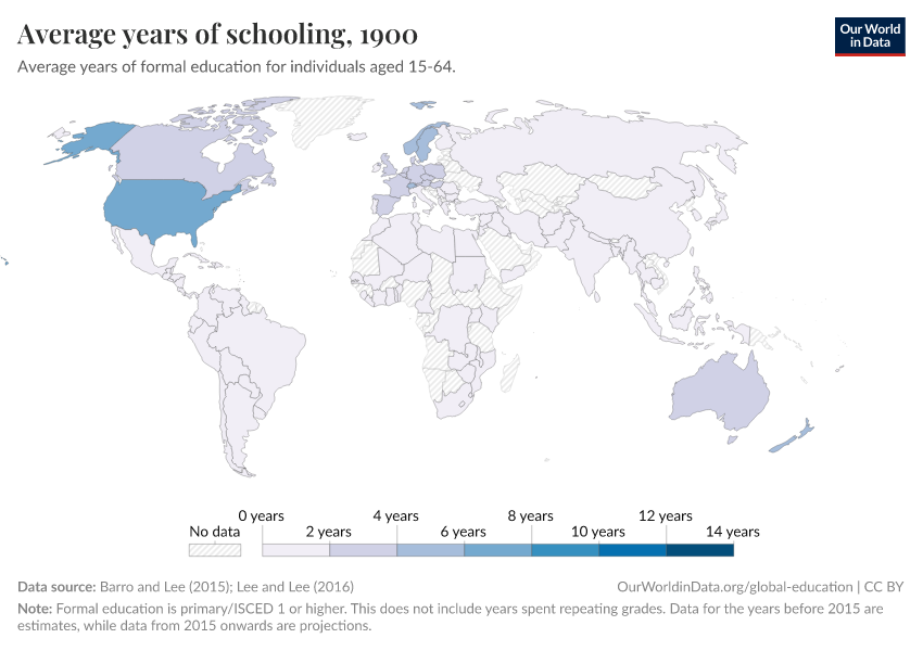 Barro and Lee (2015); Lee and Lee (2016) – with major processing by Our World in Data. “Average years of schooling” [dataset]. Barro and Lee, “Projections of Educational Attainment”; Lee and Lee, “Human Capital in the Long Run” [original data]. Retrieved November 2, 2025 from https://auto-epoch.owid.pages.dev:8789/20250909-093708/grapher/mean-years-of-schooling-long-run.html (archived on September 9, 2025).