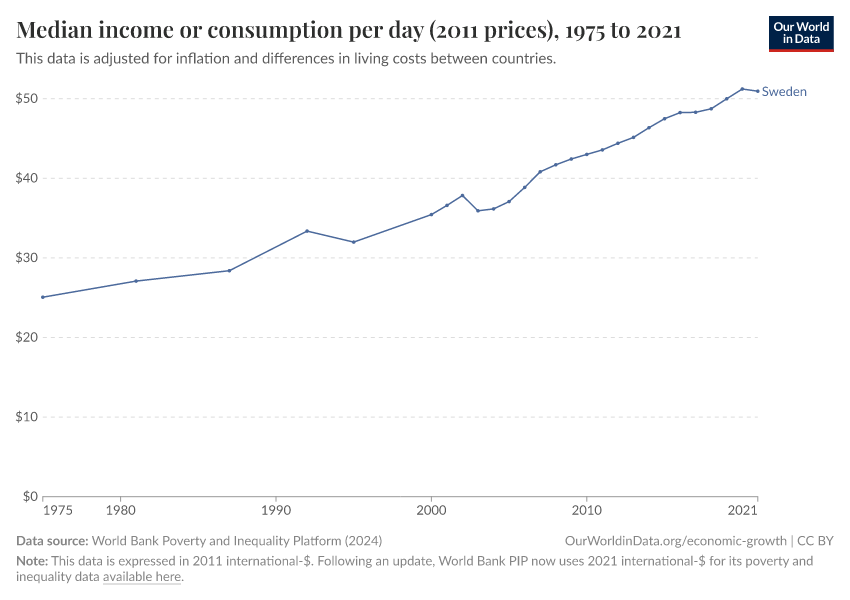 “Data Page: Median income or consumption per day (2011 prices)”, part of the following publication: Joe Hasell, Bertha Rohenkohl, Pablo Arriagada, Esteban Ortiz-Ospina, and Max Roser (2022) - “Poverty”. Data adapted from World Bank Poverty and Inequality Platform. Retrieved from https://auto-epoch.owid.pages.dev:8789/20250909-093708/grapher/median-income-or-consumption-per-day-2011-prices.html [online resource] (archived on September 9, 2025).How to cite this data